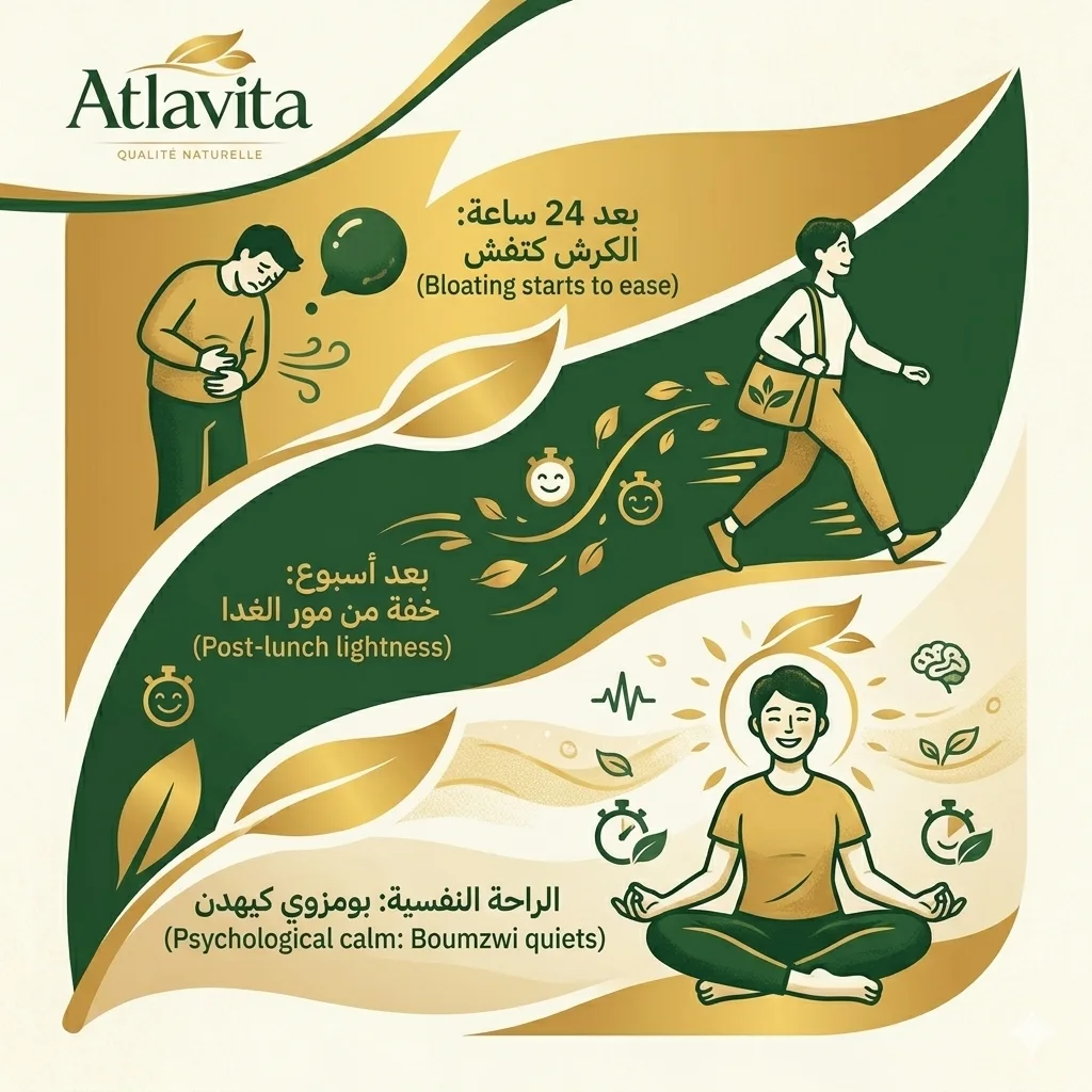 بـعد 24 سـاعـة: غتحس بالكرش ديالك بدات كتفش. داك النفخ اللي كان ديما "قاهرك" غادي يبدأ يتلاشى.