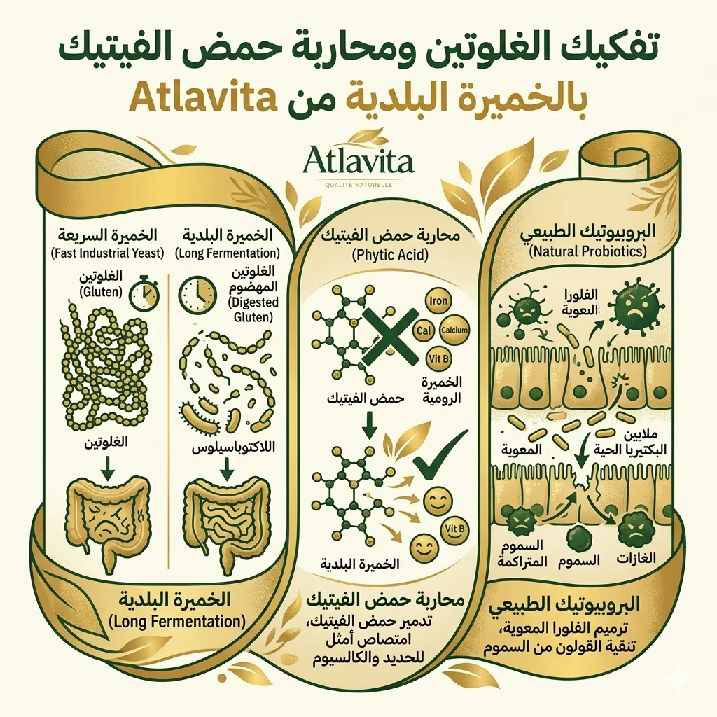 🛡️ تهضم الخبز قبل ما تاكلو (تفكيك الغلوتين): الخميرة الرومية سريعة بزاف وكتخلي "الغلوتين" قاصح على معدتك. أما خميرة Atlavita، كتاخد وقتها باش "تطحن" الغلوتين وتردو خفيف، هكذا كيوصل لمعدتك مهضوم واجد وما كيديرش ليك الحريق.